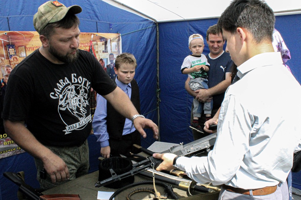 В другой палатке называющий себя казаком Роман объясняет детям конструкцию и принцип действия автомата Калашникова. Посетители ярмарки свободно берут со стола холодное и огнестрельное оружие, чтобы сфотографироваться.