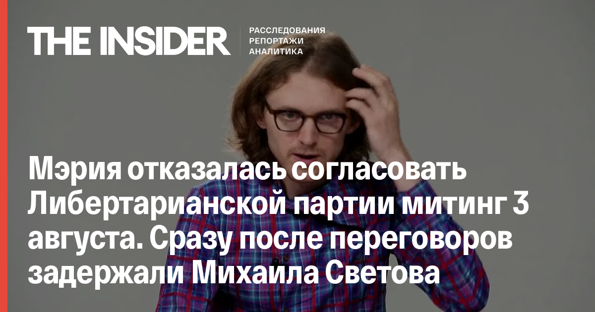 Мэрия отказалась согласовать Либертарианской партии митинг 3 августа. Сразу после переговоров задержали Михаила Светова