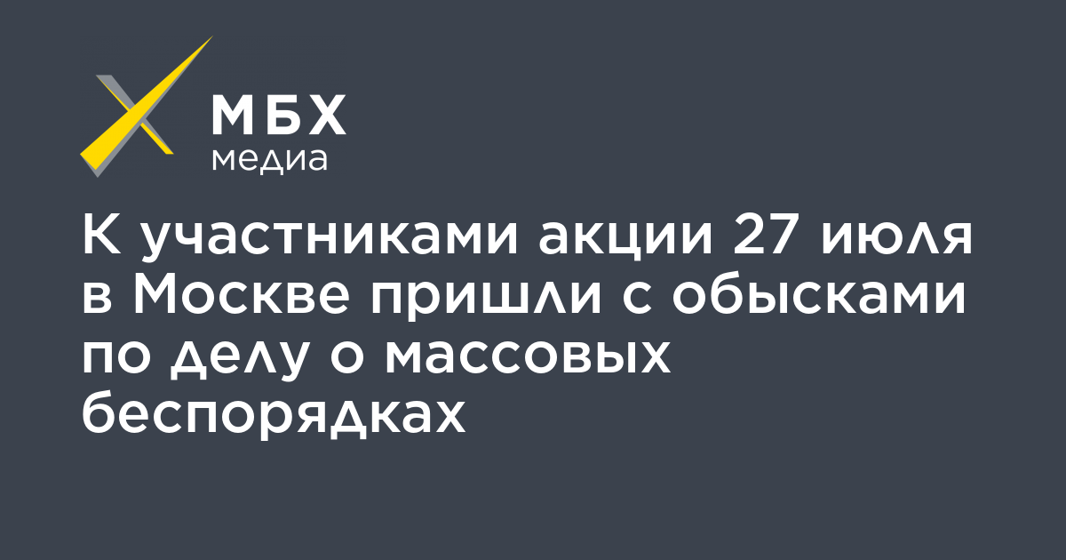 К двум участниками акции в поддержку незарегистрированных кандидатов в депутаты Мосгордумы, которая прошла 27 июля в Москве, пришли с обысками по делу о массовых беспорядках (часть 1 статьи 212 УК). Об этом «МБХ медиа» рассказала правозащитница Алла Фролова.