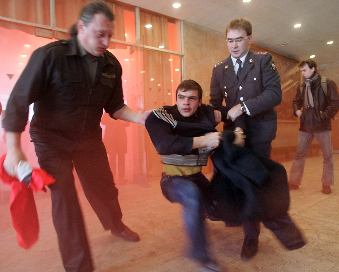 В Одинцово участники акции развернули флаги с серпом и молотом и попытались опрокинуть урну, но встретили сопротивление охраны и милиционеров. Нацболов скрутили: на фотографиях видно, как мужчины в форме хватают Червочкина за шею, а он, сопротивляясь, падает на пол у стеклянных дверей зала, наполненного красным дымом.