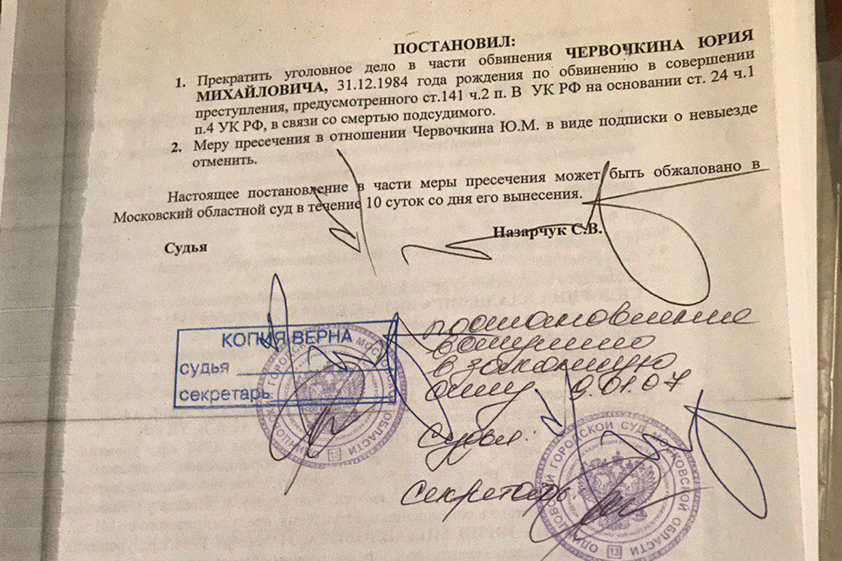 Постановление судьи Одинцовского городского суда о прекращении уголовного дела в отношении Юрия Червочкина. Документ предоставлен адвокатом Ольгой Михайловой