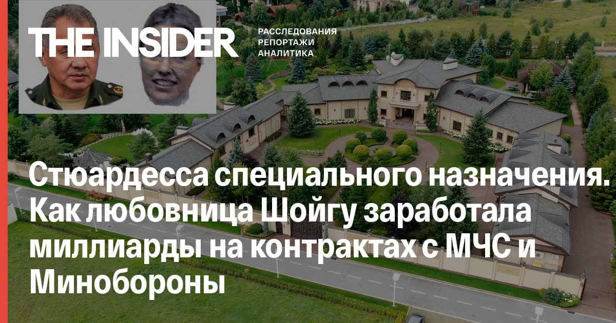 31 июля 2019Прошлый министр обороны России Анатолий Сердюков покинул свой пост на фоне коррупционного скандала с участием его любовницы Евгении Васильевой (оба, впрочем, отделались тогда легким испугом). Нынешний министр Сергей Шойгу, как удалось установить The Insider, мало чем отличается от предыдущего. После начала романа с Шойгу стюардесса Елена Шебунова внезапно стала миллиардершей и на контрактах с МЧС и Минобороны заработала себе на особняк на Рублевке по соседству с дворцом Ротенбергов.