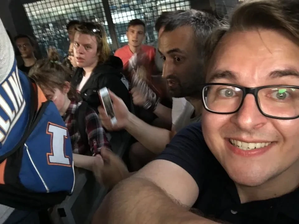 С нами был парень из «Открытой России», молодой программист. Он нас очень быстро, пока мы стояли на Трубной в ожидании наполнения автозака, проинструктировал по нашим правам. Это очень помогло психологически. Телефоны у нас, к счастью, не отобрали, поэтому час, пока мы ехали до Щербинки, мы писали в соцсети и даже создали общий чат в телеграме.