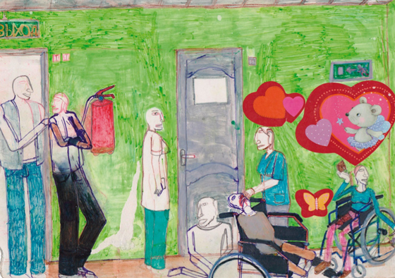 Юля живет в ПНИ, изображает то, что видит каждый день. Это как виды Фудзи во всех состояниях. Только вместо Фудзи — аппарат ДЕЗАР и стены казенного учреждения.
