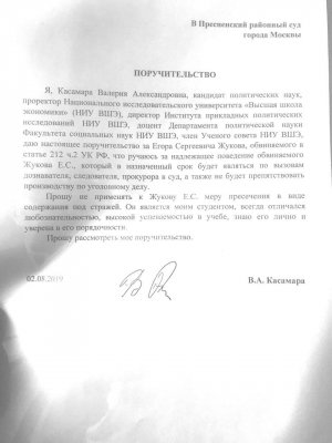 Онлайн-трансляцию с его заседания вели студенты ВШЭ, которые создали телеграм-канал в поддержку Жукова. Ранее глава «Агоры» Павел Чиков сообщил в своем телеграм-канале, что проректор ВШЭ Валерия Касамара представила в Пресненский суд личное поручительство за Жукова, который является ее студентом. За обвиняемого также поручилась член СПЧ и журналистка Russia Today Екатерина Винокурова.