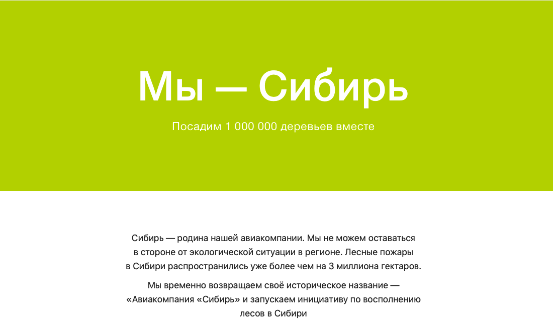 Пользователи «ВКонтакте» начали получать уведомления со ссылкой на рекомендации о действиях в случае задымления от пожаров в сибирских лесах. Это совместная инициатива социальной сети и Greenpeace. Тем временем авиакомпания S7 Airlines временно вернула свое прежнее название «Сибирь» для кампании по восстановлению пострадавших от пожаров лесов в Сибири. С 1 августа 2019 года авиакомпания будет отчислять в специальный фонд по 100 рублей с каждого проданного билета по сибирским направлениям на сайте или в приложении. К бренду S7 Airlines авиаперевозчик вернется только после того, как будет собрано достаточно средств для посадки 1 млн деревьев.