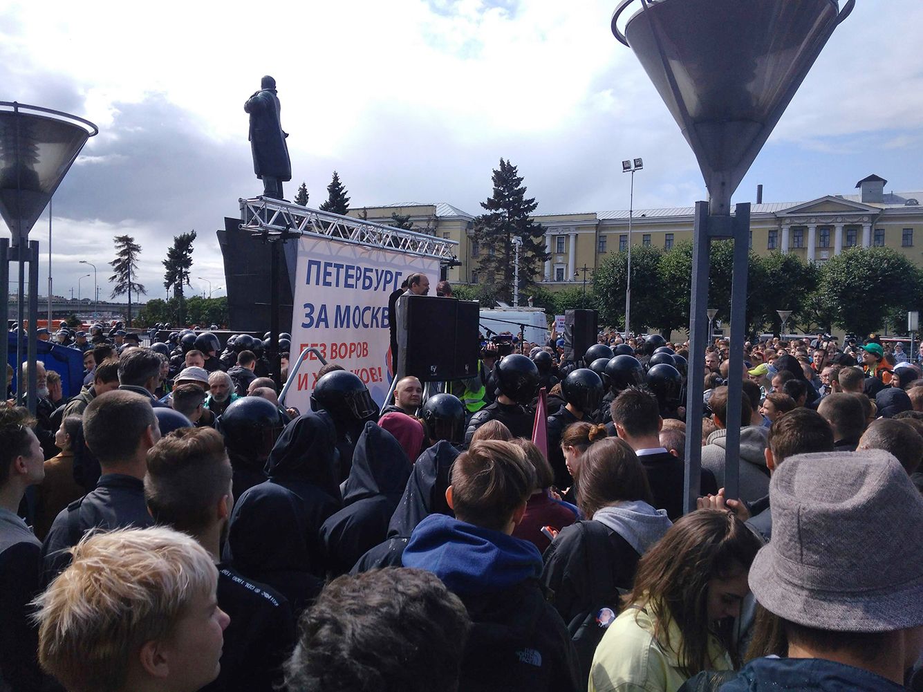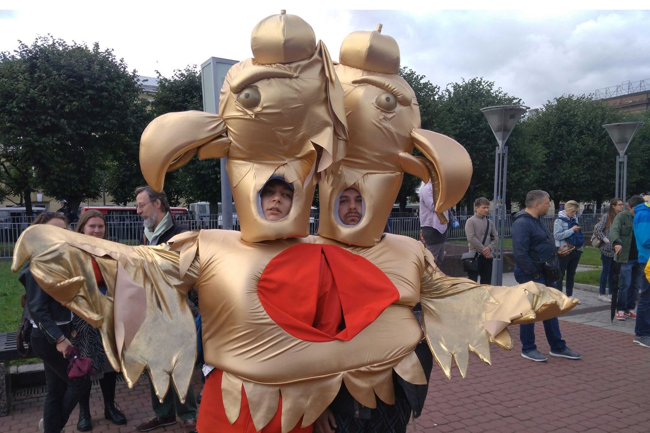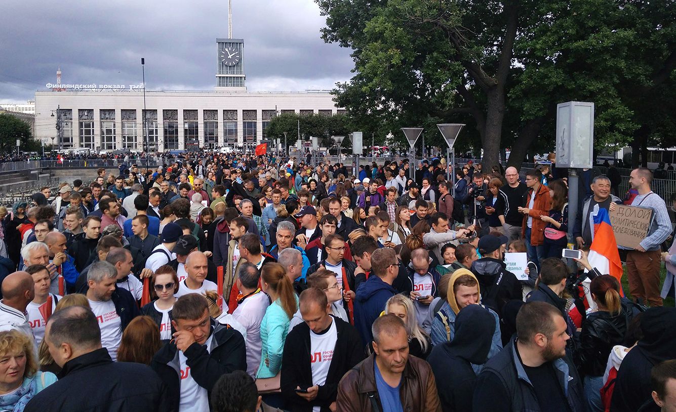 Акция сегодня проходит и в Петербурге. Она согласована. Вот как выглядит сцена. Впервые Петербург за Москву, шутит корреспондент «Медузы».
