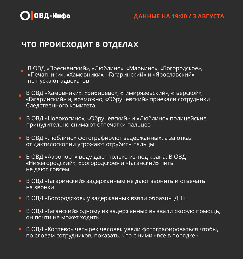 Уточнение от «ОВД Инфо»: только в 8 отделов из более 40 пустили адвокатов к задержанным.