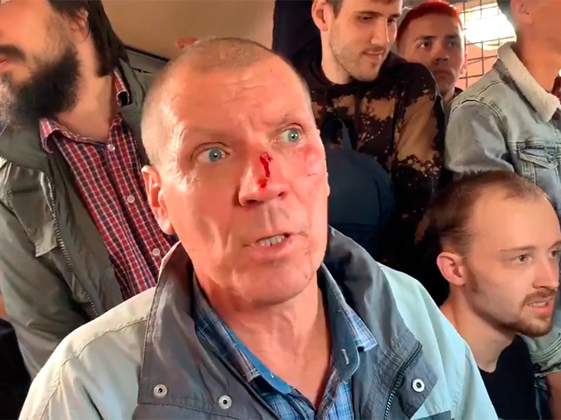 Трое силовиков в масках у ОВД "Печатники" вывели из автозака задержанного, повалили его лицом в асфальт и начали избивать. По словам задержанного Игоря Купца, который находился с пострадавшим в одном автобусе, мужчина попросил полицейских представиться, после чего его и решил забить.
