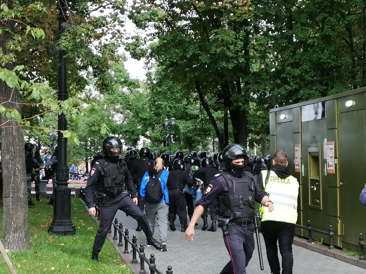 «Я стояла на Пушкинской площади, делала фотографии на телефон. Подошли двое омоновцев и сказали, чтобы я уходила. Я ответила, что журналист и нахожусь здесь по заданию редакции, они схватили меня за руки и стали требовать показать редакционное удостоверение. Я ответила, что оно в рюкзаке, отпустите — покажу. Они продолжили требовать редакционное, не отпуская рук, и повели меня в автозак. Около автозака я достала редакционное удостоверение журналиста. Они сказали, что это документы неустановленного образца, и стали требовать бейдж. Завели в автозак со словами: “На месте разберутся”. Нас 20 человек в автозаке, четверо несовершеннолетних. Жарко, окна не открываются. На наш вопрос, куда нас везут, водитель ответил: “В морг”».