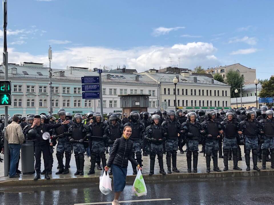 Периодически цепь на метр раздвигалась — туда проходила цепочка росгвардейцев из пяти человек, державших друг друга за левое плечо. Они вбегали на сквер, совершенно произвольно хватали какого-то человека — в шести наблюдаемых мною случаях это были мужчины, один с каким-то плакатиком, и одна женщина. Правда — не били. Бить стали позже. Журналистов с камерами скапливалось на пятачке все больше, тут был и Тимур Олевский с камерой «Настоящего времени», и Павел Лобков с «Дождя», и куча иностранцев, и тогда ОМОН решил выдавить журналистов на другую сторону дороги, подальше от сквера. В отличие от 27 июля удостоверения прессы здесь не работали. «С какого бодуна вы не даете нам работать?» — спросила я одного из них, который вместе с коллегами пытался выдавить меня на проезжую часть. Он как-то удивленно посмотрел на меня. Я добавила что-то про то, что я в журналистике 40 лет, а он, пацан, рассказывает мне, где и как я должна выполнять свои профессиональные обязанности — исполнять конституционное право сограждан на информацию. Цепочка остановилась, в дискуссию вступили и другие журналисты, но последовал окрик откуда-то сзади, и нас все оттеснили от сквера. Потом эта же цепь вытеснила людей и со следующей площадки.
