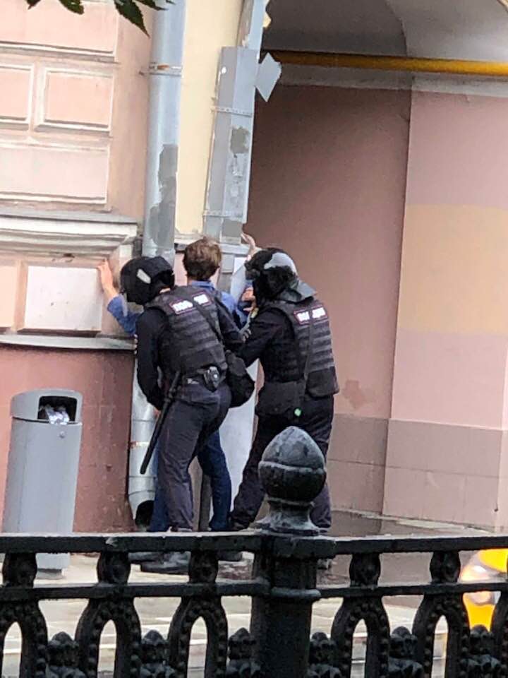 Люди сверху шли по тротуару внутренней стороны улицы, шли плотной толпой. Коллеги сообщили, что только что было жесткое винтилово на Пушкинском сквере, народу было очень много, разгоняли жестко. Тут на тротуаре внешней стороны бульвара показалась толпа, которая шла плотным маршем от Пушкинской площади. Я попыталась пройти, но меня не пропустила цепь Росгвардии. На просьбу позвать старшего ко мне подошел майор Голованов Игорь Викторович. Я представилась и предъявила удостоверение, он сказал, что я могу пройти по тротуару, при этом его явно веселила ситуация: он знал, что на тротуаре стоит Росгвардия, которой дан приказ никого не пропускать. Рядом — пара то ли эшников (сотрудников Центра «Э»), то ли чекистов — молодые ребята лет под тридцать, они тоже забавлялись ситуацией. И действительно: на тротуаре Росгвардия отметелила тех, кто шел от Пушкинской площади. В этот момент начались задержания на Петровке, между Страстным и Петровским бульварами: Росгвардия брала людей в коробочку, давила, выхватывала тех, кого почему-то решили забрать, передавала полицейским, которые тащили человека в автозак, и давила дальше. Если в прошлую субботу, 27 июля, омоновцы выглядели скорее подавленными, по рациям запрашивали подкрепление, которого не было, несмотря на то, что половину личного состава Росгвардии свезли со всей страны в Москву, то 3 августа они явно чувствовали себя значительно более раскованно. Возможный страх получить нагоняй за превышение власти и избиение лежащих на тротуарах людей очевидно был нивелирован: вероятно, перед субботой 3 августа им объяснили, что есть приказ с самого верха — «не давать спуску», «не проявлять слабину, это враги президента и России, они выходят за госдеповские деньги». Они и не давали. При этом враждебность Росгвардии сегодня чувствовалась значительно сильнее, чем неделю назад.