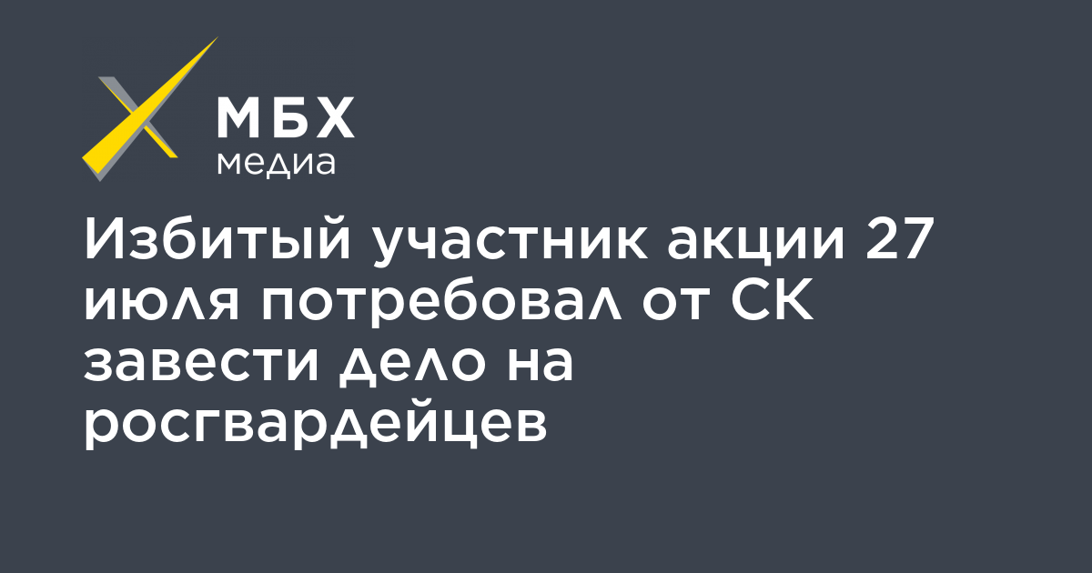 Член Либертарианской партии Андрей Забурдяев, которому во время акции 27 июля в Москве разбили голову дубинкой, подал в Следственный комитет заявление, в котором потребовал завести на сотрудников Росгвардии уголовное дело о превышении полномочий. Об этом Забурдяев сообщил «МБХ медиа».