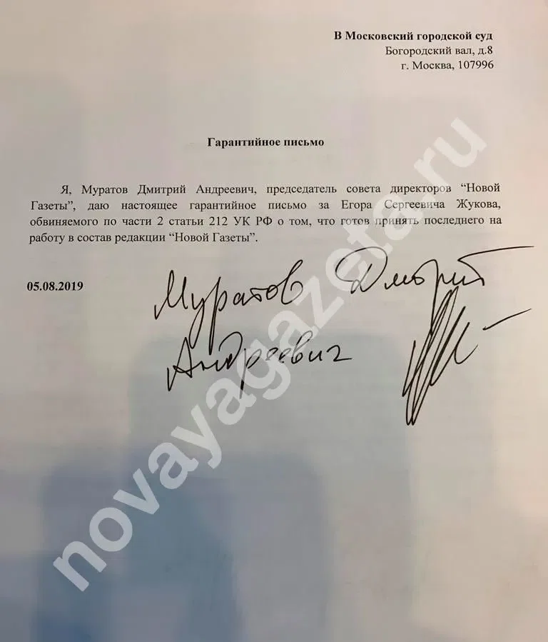 Также Муратов и Венедиктов предоставили суду гарантийные письма о том, что готовы принять Жукова на работу в «Новую газету» и «Эхо Москвы».
