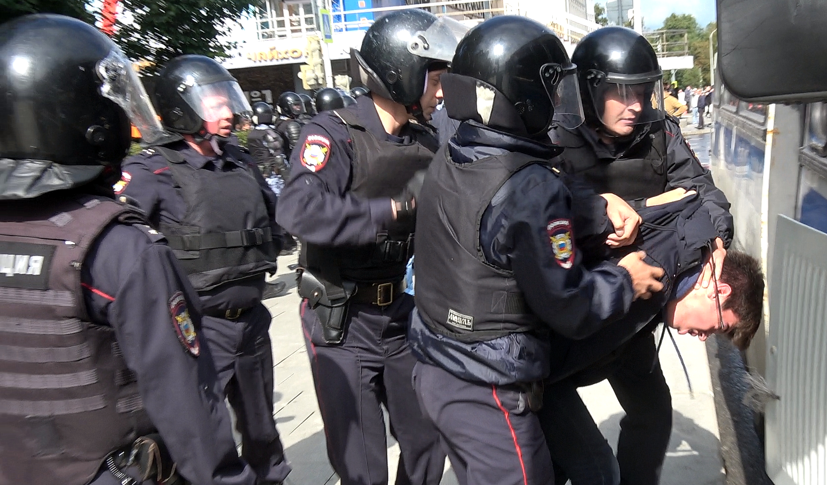 Один из тех, кого вывели из автозака, спросил: "А где же понятые, где протокол?", за что получил несколько ударов