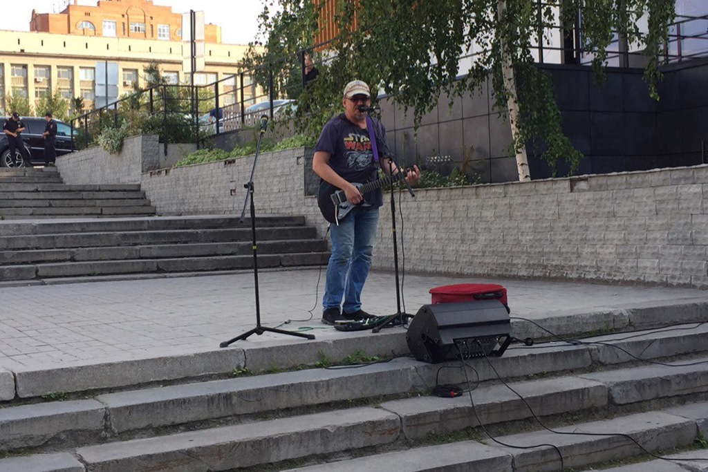 18:25 Сцена расположилась на ступенях на входе в Нарымский сквер. На акцию уже пришел заявитель митинга Сергей Дьячков.