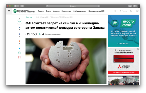 Сайты Федерального агенства новостей (РИА ФАН), изданий «Народные новости» и «Экономика сегодня», а также газеты «Журналистская правда» оказались в чёрном списке «Википедии». Теперь ссылки на них невозможно добавить ни в одну статью.