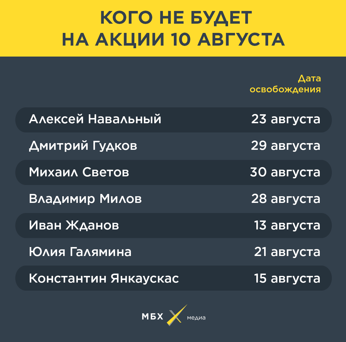 Чтобы люди перестали митинговать, арестовали лидеров протеста. Всех незарегистрированных кандидатов, кроме Любови Соболь, привлекли к административной ответственности. Соболь получила штраф только потому, что у нее есть несовершеннолетняя дочь. В это время Алексея Навального, Дмитрия Гудкова, Михаила Светова и ведущего YouTube-канала «Навальный Live» Владимира Милова арестовали на 30 суток.