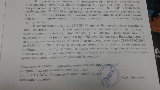 - Это уже пятое уголовное дело по следам майских протестов против строительства храма в сквере. В мае стало известно, что против местного жителя Вадима Панкратова возбудили дело о применении насилия к полицейскому. Также заведены дела о призывах к массовым беспорядкам (ст. 212 УК), о повреждении чужого имущества (ч. 1 ст. 167 УК) и об оскорблении представителей власти (ст. 319 УК).