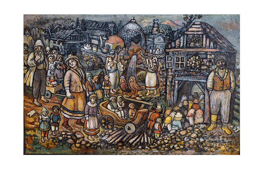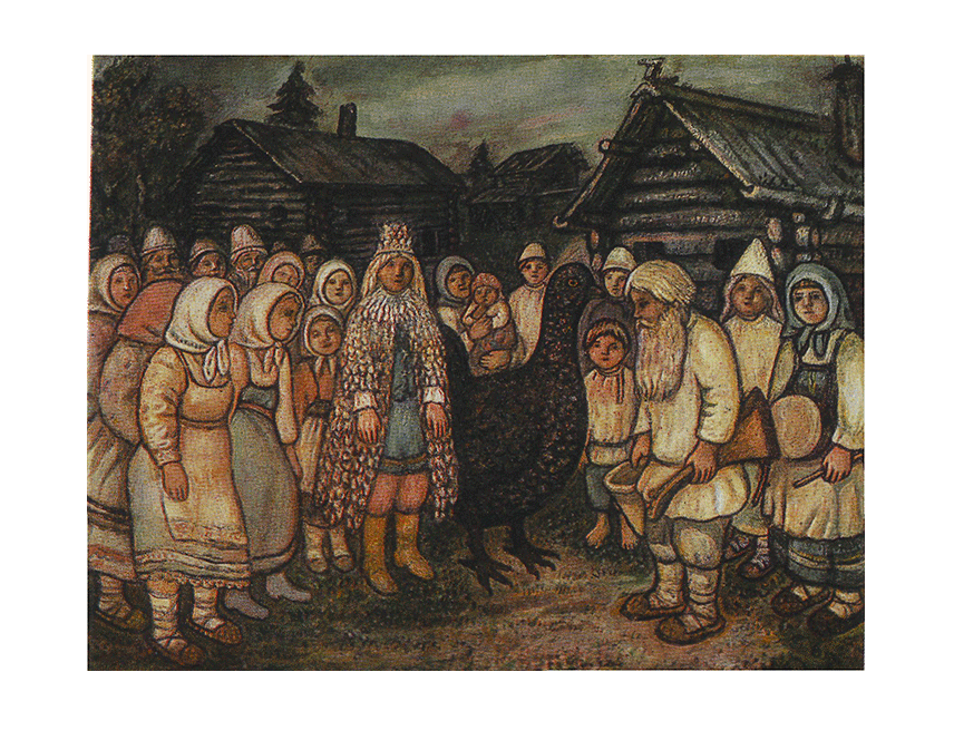 ТС: Мало того, он свои произведения еще и озвучивал, вот что важно. Честняков соединил изображение и слово. У него был театр на первом этаже дома, который ему крестьяне построили из овина, когда он из Петербурга вернулся. Там у него одна за другой висели картины на планочках (поскольку он бедствовал, подрамников ему было негде взять). И вот встанет Честняков перед одной из этих картин и начинается, по сути дела, спектакль одного актера — рассказывает, что и как на картине его происходит. Поэтому все его литературные труды проиллюстрированы живописью или графикой, в рукописных книгах тоже картинки везде. Еще у него для представлений были глиняные скульптурки, и он ходил по деревням с той самой тележкой-ондрецом, нагрузив ее всем, картинами, скульптурками, а еще он костюмчики делал детишкам, маски из глины. Приезжает в деревню, на крыльцо какой-нибудь избы все соберутся, и начинается спектакль. Когда было несколько героев в представлении, он детишек привлекал, детки играли, радовались, он с ними и народные песни пел. По сути, он придумал то, что сегодня называют перформансами, только гораздо раньше чем многие.