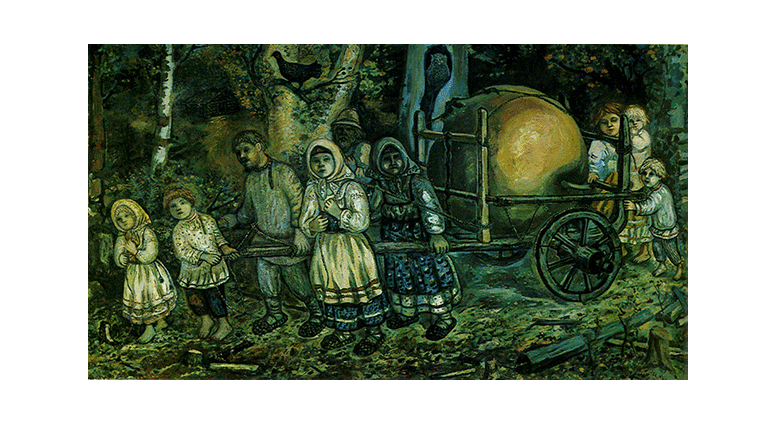 ЕВ: Сказка начинается с того, что в одной крестьянской семье было много парнеков (мальчиков) и девонек (девочек). Однажды старый дед пошел в лес рубить дрова и увидел старую яблоню, на которой висело огромное яблоко. Он решил это яблоко забрать домой, сначала хотел увезти его на лошади, прикатил ондрец (это костромское диалектное название деревянной двухколесной тележки), но лошадь не смогла сдвинуть тележку с яблоком с места. Тогда он впрягся сам, но тоже ничего не вышло. Есть еще персонажи в этой сказке, филин и тетерев, которые смеются над ним, говорят: не увезешь, зови всех, кто дома есть. И он по очереди всех из своей семьи приводит, тележку тянут дед с бабкой, их сын, и жена, и внуки. И вот они почти все уже пришли постепенно, а филин и тетерев все смеются: зови, мол, всех до выгреба, у тебя там нянька дома с маленьким ребенком. Так они и не смогли увезти яблоко до тех пор, пока не пришла няня с ребенком, только вместе с ними удалось сдвинуть ондрец — тогда они привезли тележку с яблоком домой, угостили всех родных, соседей, сварили всякого кушанья из этого яблока, и хватило им его до самого Христова дня. Долго-долго ели, полгода, наверное. Честняков был ярым приверженцем использования народных слов в литературных текстах. В этой сказке, как и во многих других его литературных произведениях, большое количество кологривских диалектизмов. Именно народные слова придают особый колорит его текстам.