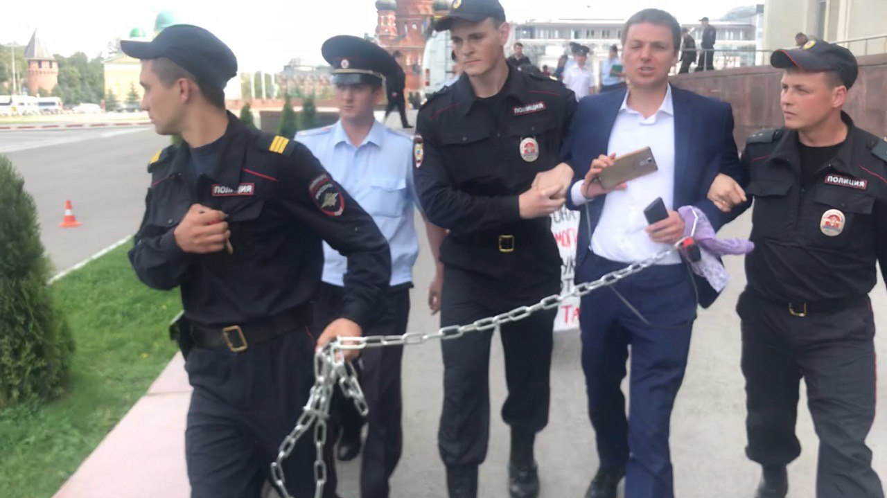 Сначала коммунист, приковавший себя цепью к ограждению, около часа с плакатом сидел на шезлонге. Как пишет «Росбалт», после появления провокатора с плакатом полицейские сказали, что это уже не одиночный пикет, и задержали кандидата. Цепь распилили сотрудники службы спасения, после чего полицейские увели Корецких.