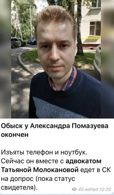 13:10 Обыск у Александра Помазуева закончен, его везут на допрос. При обыске к нему применили силу, сообщает Любовь Соболь в твиттере.