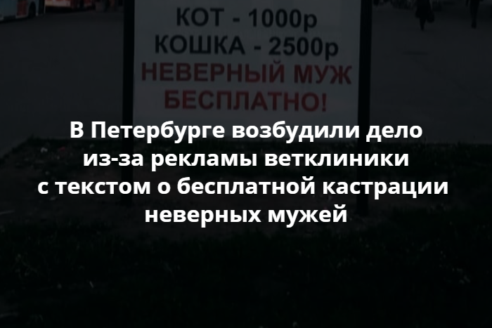 Петербуржцы отправили в УФАС пять жалоб на рекламу ветклиники с текстом «Акция! Кастрация! Кот —1000 р. Кошка — 2500 р. Неверный муж бесплатно».