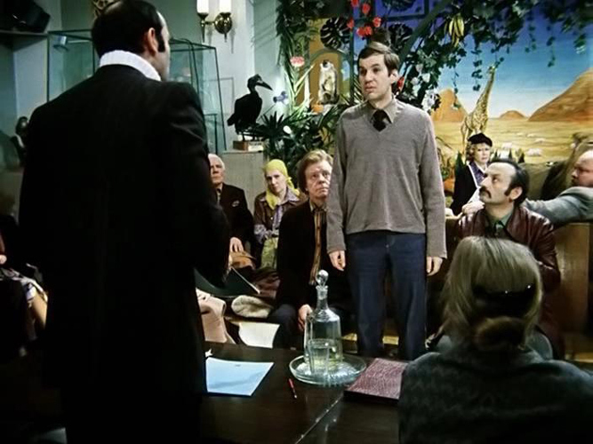 Дружеский шарж Рязанова на мосфильмовское жилтоварищество кажется сегодня не только образцовой брехтовской «дидактической пьесой», участники которой разыгрывают хорошо знакомый им по реальной жизни конфликт (как известно, фильм снят под впечатлением реального заседания гаражного кооператива «Мосфильма»), но и мощной антикапиталистической сатирой. Этот месседж удачно совпал с решением очередного пленума ЦК энергичнее критиковать общественные недостатки, так что начальство «Мосфильма», с самого начала настороженно относившееся к проекту Рязанова и Брагинского, пропустило на экран столь удручающий портрет советского среднего класса. В своем гиперболизированном описании нравов и быта мелких столичных собственников Рязанов словно повторяет хардкорный марксистский постулат о том, что капитализм есть преступление. Войны хозяйствующих субъектов позднего застоя выглядят точь-в-точь как сводки из Москвы конца десятых: поджоги и подлоги, уничтожение зеленых насаждений, приписки и черная бухгалтерия, драки, угоны машин и порча имущества. Собственность — железобетонная коробка гаража — превращает товарищей не просто в господ, а сразу в зверей. Эта фауна помещена Рязановым в довольно сюрреалистический антураж зоомузея — эдакий советский Бунюэль/Феррери. Чучела пингвинов, скелеты мамонтов и картонная модель рыбы-иглобрюха абсурдно соединяются с элементами водевиля (что там творится за белым медведем?) и трагедии (безумие героини Немоляевой). Собрание пайщиков — полноценный советский микрокосм с товарищем Карпухиным (одетым как имперсонатор партийного бонзы) на верхушке пищевой цепи и лишенным голоса (и представительства) пролетарием-лаборантом Хвостовым в самом низу; трудно выбрать фильм, более подходящий для иллюстрации темы «Городские микросообщества».