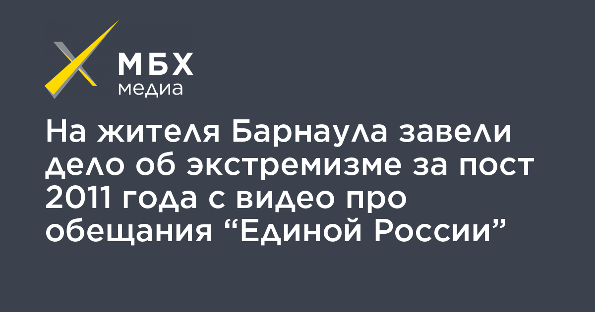 На жителя Барнаула Олега Григорьева завели административное дело по статье 20.29 КоАП (производство и распространение экстремистских материалов) за публикацию в 2011 году на его странице во «ВКонтакте» видео с обещаниями «Единой России» . Об этом он сообщил «МБХ медиа».