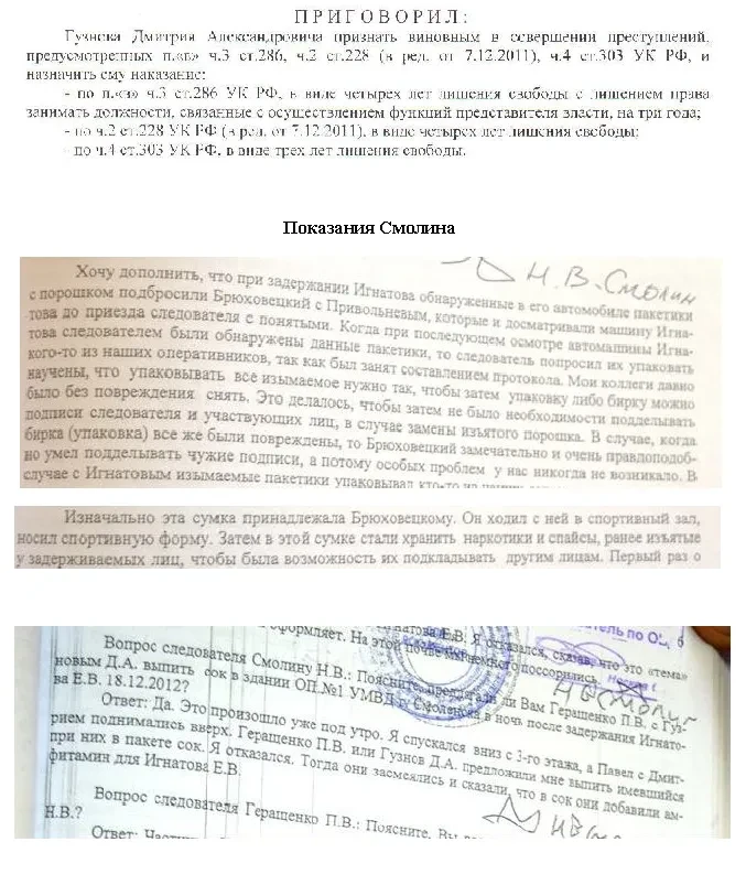 «При задержании Игнатова, обнаруженные в его машине пакетики с порошком подбросили Брюховецкий и Привольнев, которые и досматривали его машину до приезда следователя с понятыми. Когда <…> следователь их обнаружил, он попросил их упаковать кого-то из наших оперативников <…>. Мои коллеги давно научены, что упаковывать все изымаемое нужно так, чтобы затем упаковку, либо бирку можно было без повреждения снять <…> чтобы не было необходимости подделывать подписи следователя и участвующих лиц в случае замены изъятого порошка <…> когда бирка (упаковка) все же были повреждены, то Брюховецкий <…> правдоподобно умел подделывать чужие подписи, а потому особых проблем у нас не возникало никогда».