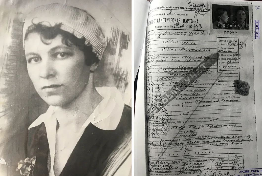 В постановлении об избрании меры пресечения в отношении Маториной Нины Михайловны 32 лет, социальное происхождение — «дочь личного дворянина», указано: «изобличается в том, что… до последнего времени поддерживала связи с сестрой, высланной из Ленинграда за к-р [контрреволюционную] троцкистско-зиновьевскую деятельность, и братом Моториным Николаем Мих., арестованным за террористическую деятельность, которым оказывала материальную помощь».