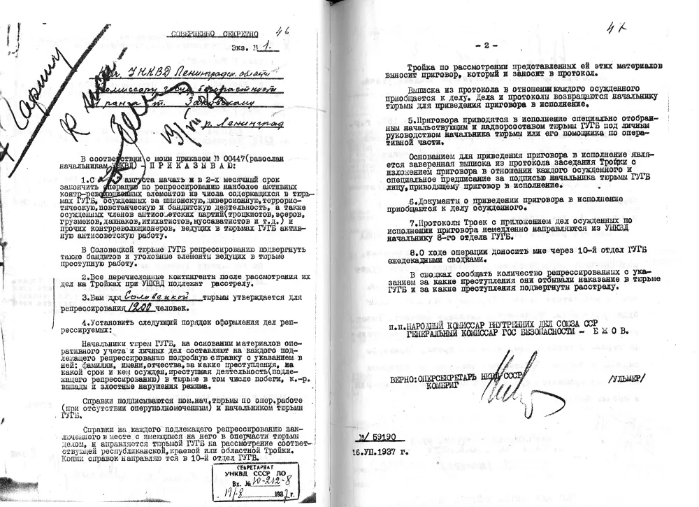 После совершенно секретного приказа 0047, подписанного наркомом внутренних дел Ежовым и давшего начало Большому террору, НКВД выпускало конкретизирующие документы: где, сколько, кого. 16 августа 1937 года вышел приказ № 59190, адресованный начальнику УНКВД по Ленинградской области Заковскому: «О завершении операции по репрессированию наиболее активных контрреволюционных элементов из числа содержащихся в тюрьмах ГУГБ». В документе, в частности, «утверждалось для репрессирования 1200 человек», заключенных в Соловецкой тюрьме особого назначения (СТОН). «Осужденных за шпионскую, диверсионную, террористическую, повстанческую и бандитскую деятельность, а также осужденных членов антисоветских партий (троцкистов, эсеров, грузмеков, дашнаков, иттихадистов, мусаватистов и т. д.) и прочих контрреволюционеров, ведущих в тюрьмах ГУГБ активную антисоветскую работу».