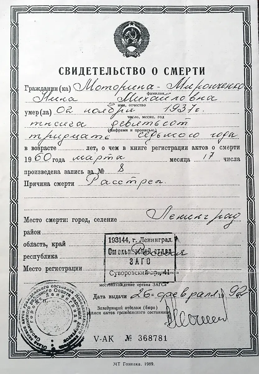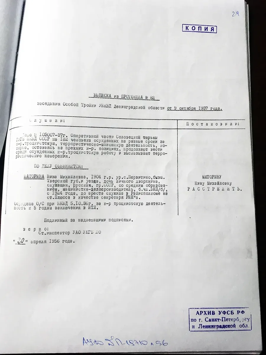 Нину Маторину расстреляли 2 ноября. Ее дочь Нина узнает об этом в 1956 году, а в феврале 1992-го Смольнинский отдел ЗАГС г. Ленинграда выдаст ей свидетельство о смерти матери. В документе укажут причину смерти: расстрел.