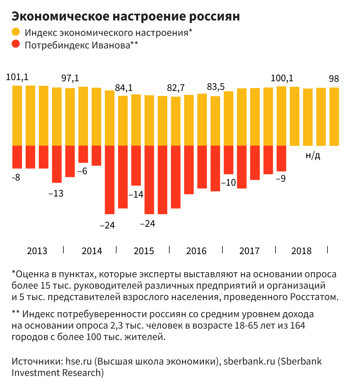 - После присоединения Крыма бизнес не заявлял о своем недовольстве стремительной изоляцией. Его фиксировало разве что падение различных индексов, выведенных на основании анонимных опросов предпринимателей и представителей среднего класса. К концу 2018 года у последних настроение было таким, что Сбербанк, похоже, просто опустил публикацию результатов своего традиционного исследования под названием «индекс Ивановых» (см. график).