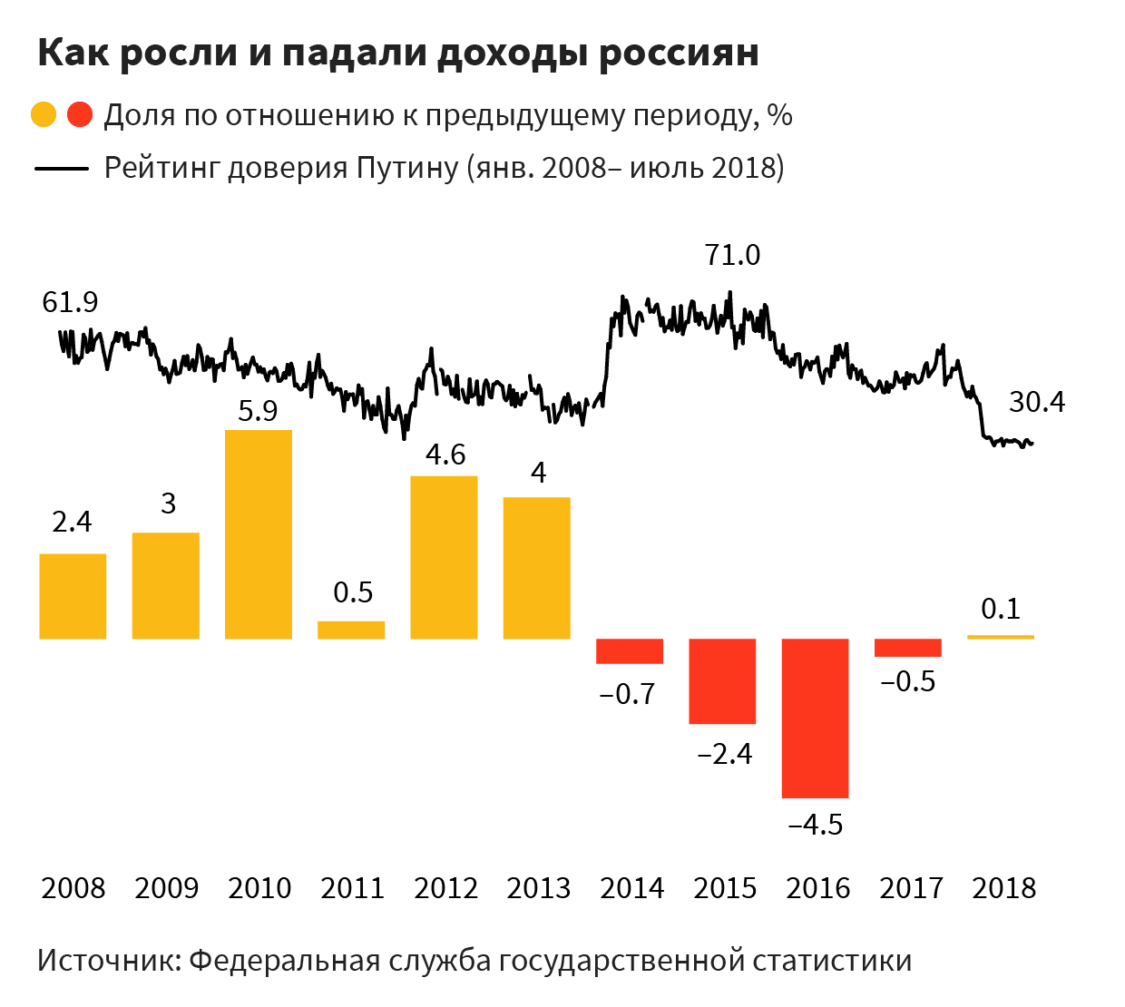 Что мне с этого? Плохой договор между бизнесом и властью, отсутствие в ней своего представительства и сильного голоса пока привел к двум очевидным последствиям: стагнации в экономике и планомерному ухудшению жизни людей, а вместе с ними — к падению популярности Владимира Путина.