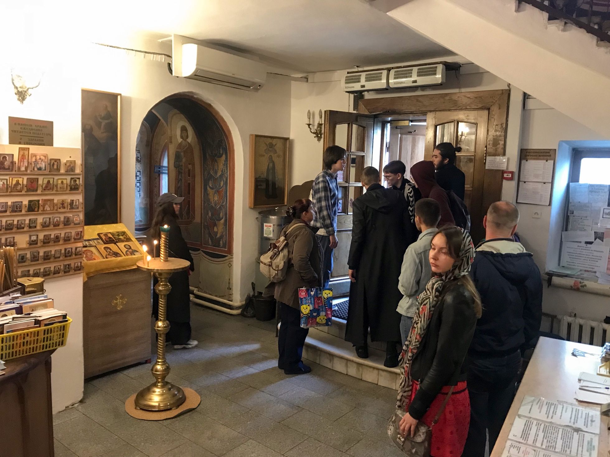 Саша Горохова / «Медуза» Люди, гулявшие по центру Москвы, укрываются от полицейских в храме Николая Чудотворца в Кленниках на улице Маросейка. Днем 10 августа сотрудники правоохранительных органов массово задерживают гуляющих москвичей после согласованной акции на проспекте Сахарова. Аналогичный эпизод произошел 27 июля — тогда участники акции в центре Москвы укрылись от полиции в храме Космы и Дамиана в Шубине.