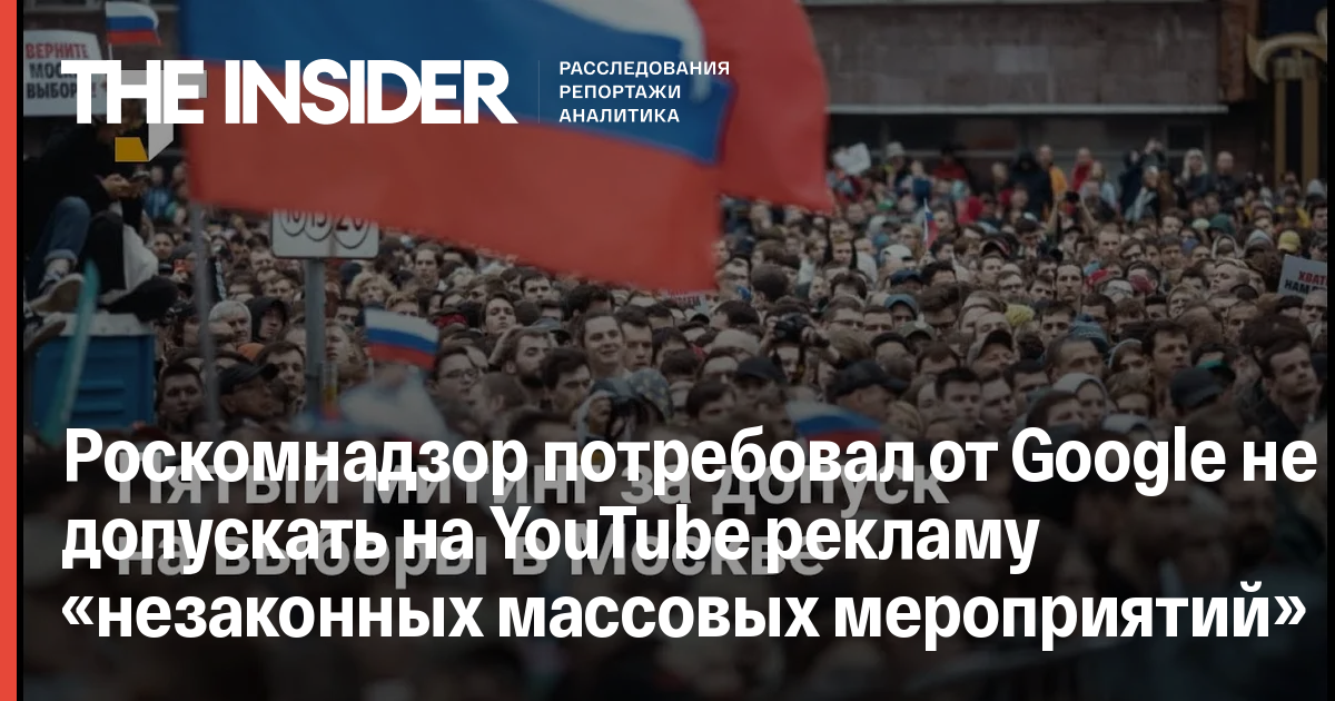 Роскомнадзор потребовал от Google не допускать на YouTube рекламу «незаконных массовых мероприятий»