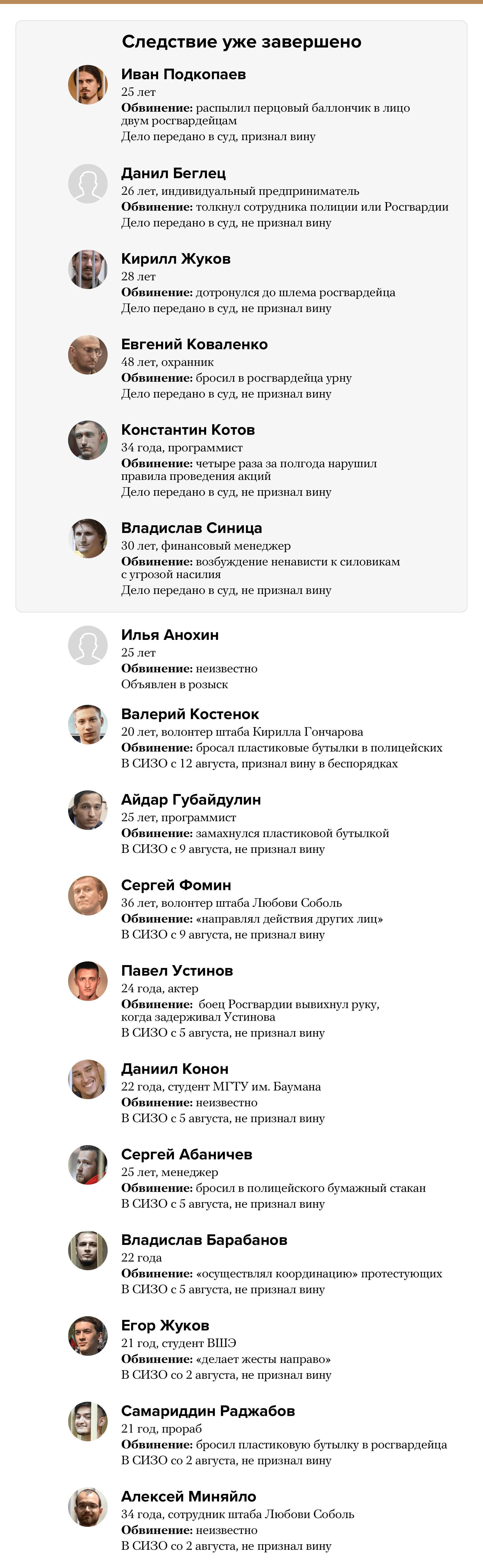 30 июля Следственный комитет возбудил дело по статье о массовых беспорядках, которые якобы имели место на несогласованной акции 27 июля в центре Москвы. За две недели фигурантами «московского дела» стали 14 человек, информация о еще одном задержанном пока не подтверждена. В большинстве случаев суды отправили фигурантов в СИЗО, несмотря на отсутствие конкретных обвинений или доказательств их участия в беспорядках. Подготовлено по данным «Медиазоны», картинка будет обновляться по мере появления новой информации.