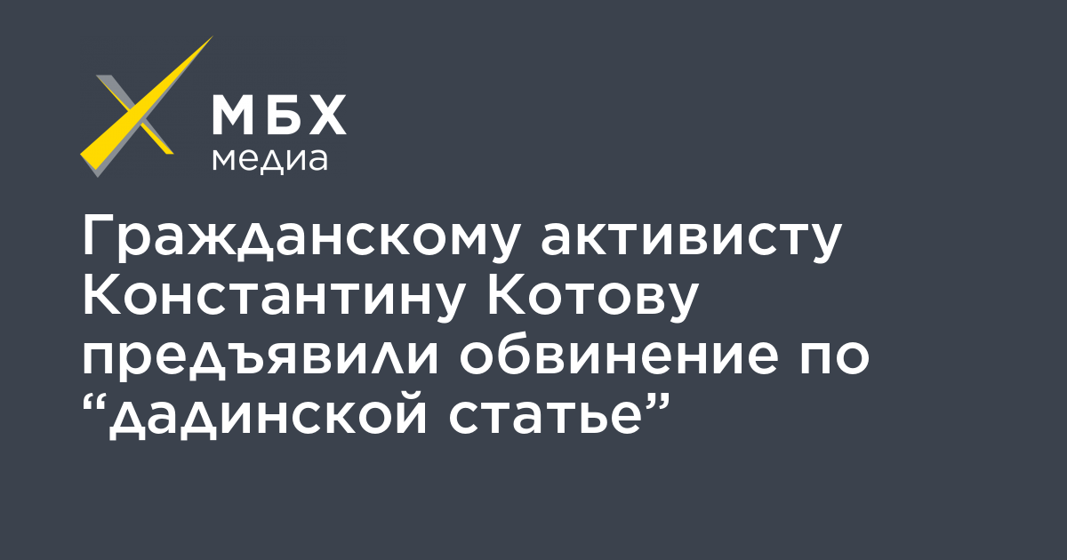 Гражданскому активисту Константину Котову предъявили обвинение по «дадинской статье» (о неоднократных нарушениях на митингах — ст. 212.1 УК). Об этом «МБХ медиа» сообщила его адвокат Мария Эйсмонт.