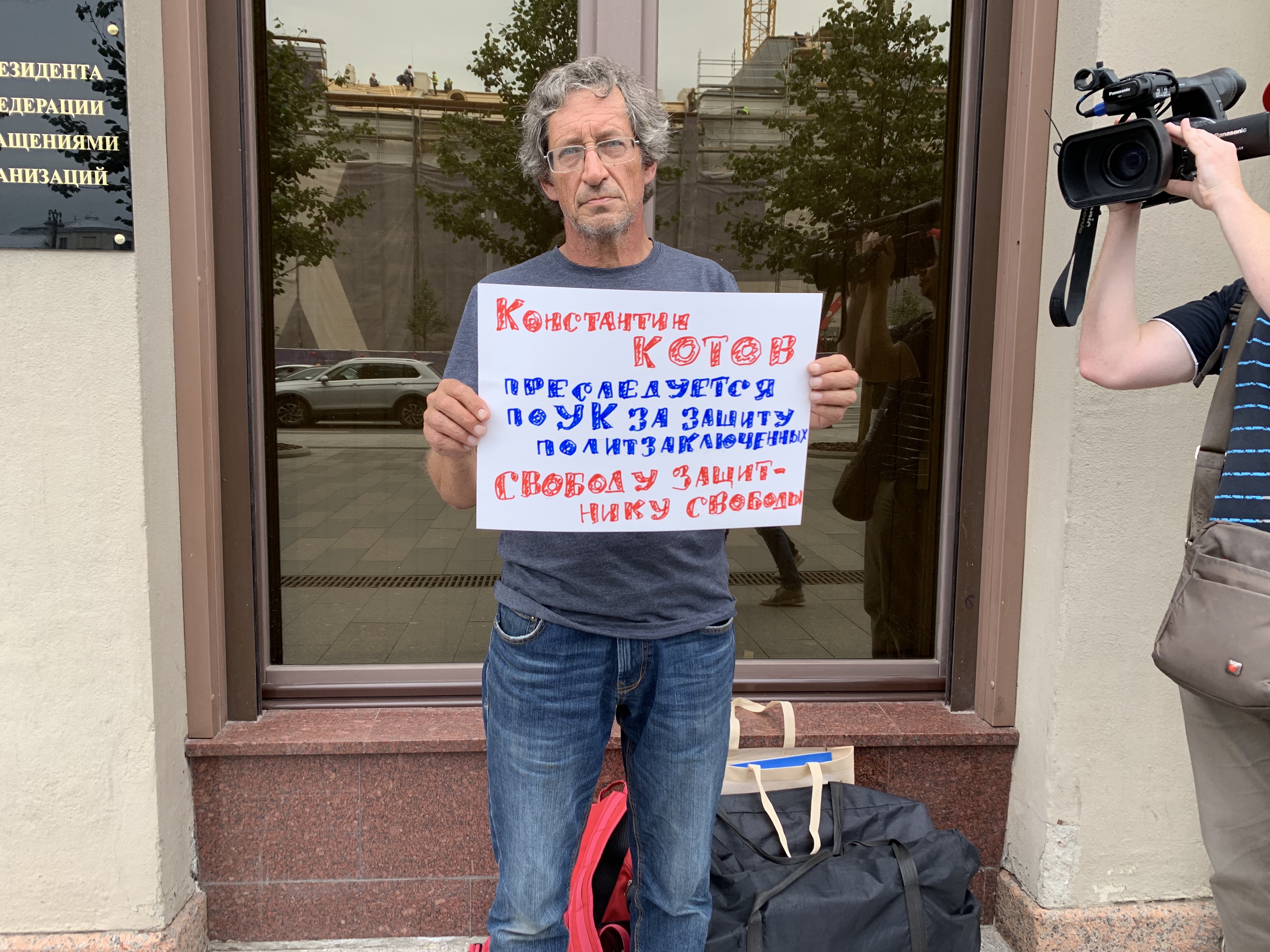 13 августа, середина рабочего дня. Погода в Москве хорошая. У одного из зданий администрации президента на Старой площади стоит мужчина лет 50-ти, в руках он держит плакат с надписью «Константин Котов преследуется по УК за защиту политзаключенных. Свободу защитнику свободы».