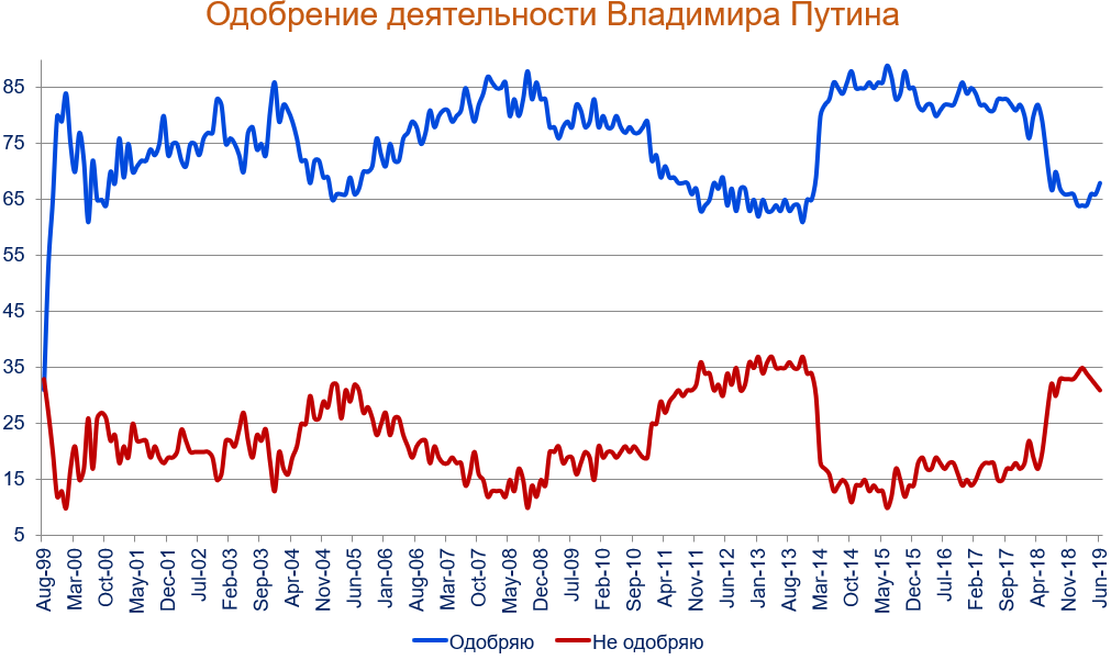 А дальше почти сразу разразился мировой кризис. С этого момента начинается длительный период падения популярности Путина – до конца 2013 года. Я вообще тогда думал, что это необратимый процесс его делегитимации в глазах общества. В декабре 2013 года была достигнута низшая точка рейтинга – 61%. Но тут начинается Майдан, разворачивается совершенно невероятная по демагогии, интенсивности, ожесточению антизападная, антиукраинская пропаганда, связанная с аннексией Крыма, рейтинг мгновенно взлетает, максимум приходится на 2015 год – 89%. После этого, если говорить о длительных трендах, он медленно спадает, поскольку начинается усталость от милитаристской мобилизации, доходы идут вниз, есть страх перед большой войной, о чем наши респонденты постоянно говорили. Начинается медленный процесс спада, идущий до лета 2018 года. Тогда Путин подписывает законопроект о повышении пенсионного возраста и тем самым принимает на себя полную ответственность за положение дел.