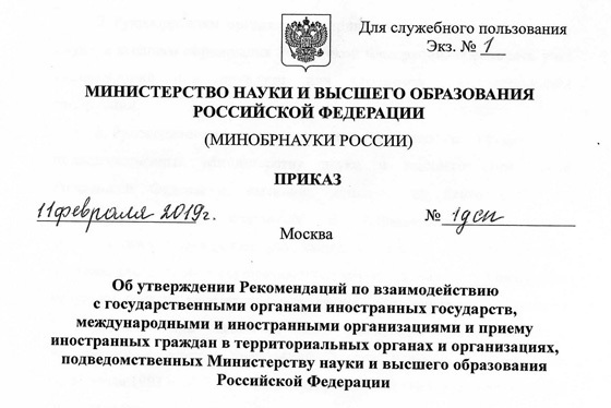 Согласно документу, Минобрнауки рекомендует российским научным организациям за пять дней до встречи с иностранцами уведомлять об этом министерство, указывая при этом всех участников с российской стороны. Встречаться за пределами организации разрешается не менее, чем двум сотрудникам с российской стороны и при условии получения разрешения.