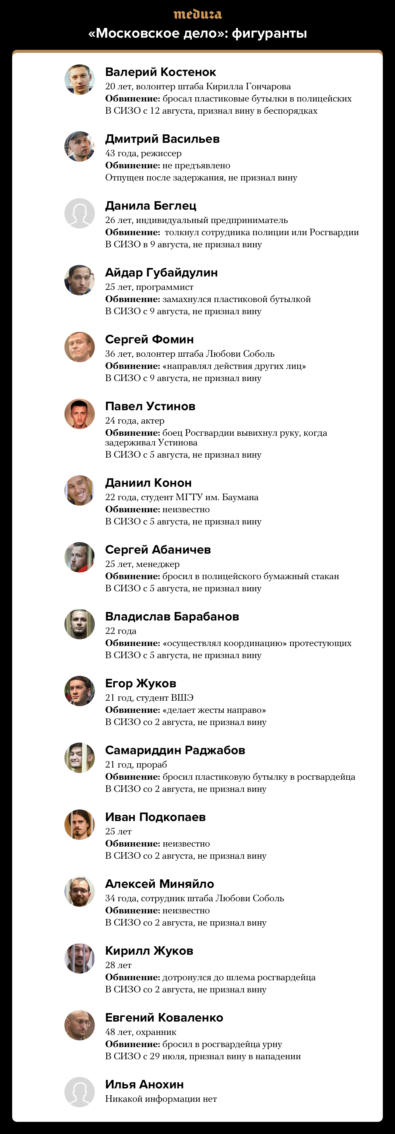 Нынешние фигуранты «московского дела» — это обычные участники митинга: студенты, предприниматели, активисты и волонтеры предвыборных штабов кандидатов. Все обвиняемые арестованы на два месяца — более мягкую меру пресечения не избрали даже Костенку, который единственный из всех признал вину. Следствие хотело арестовать даже страдающего сахарным диабетом режиссера Дмитрия Васильева, но он попал в реанимацию после задержания — из-за того, что у него отобрали инсулин. В итоге Васильев остается в статусе подозреваемого и без меры пресечения. При желании СК может просить об аресте снова: следствию не отказали, а вернули ходатайство без рассмотрения, так как Васильева не было на заседании.