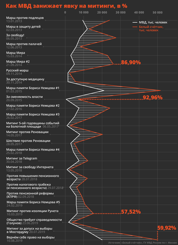 Если сравнить подсчеты МВД и «Белого счетчика», получится, что в ведомстве занижают явку на митинги — в среднем примерно на 60%. И это — если брать сухие показатели волонтерских счетчиков. В реальности на митингах может быть чуть больше людей.