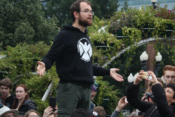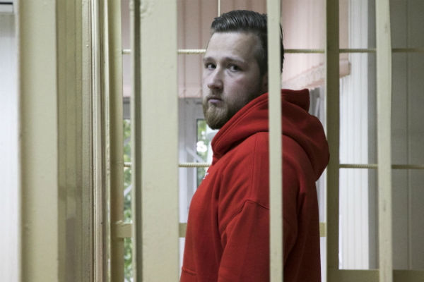 Обвинение: бросил пластиковую бутылку в полицейского "без цели причинить вред здоровью представителя власти", потом бросил еще одну пластиковую бутылку в другого полицейского, одна из них попала в каску. Признал вину. 3 сентября СКР прекратил его уголовное преследование.