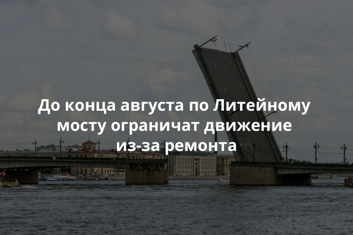 С 16 по 27 августа движение по Литейному мосту будет ограничено из-за ремонта. Об этом сообщает «Деловой Петербург» со ссылкой на пресс-службу Государственной административно-технической инспекции.
