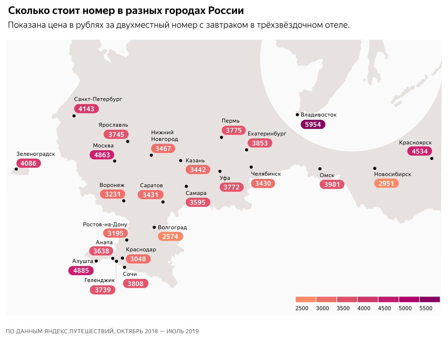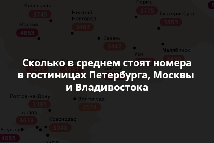 Самыми дорогими оказались отели во Владивостоке. Средняя цена номера составила 5954 рубля. Самыми дешевыми «Яндекс» назвал отели в Волгограде, где средняя цена за комнату составляет 2574 рубля. В Петербурге средняя цена — 4143 рубля.
