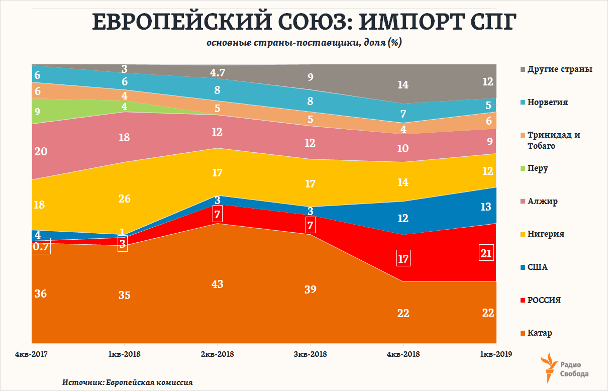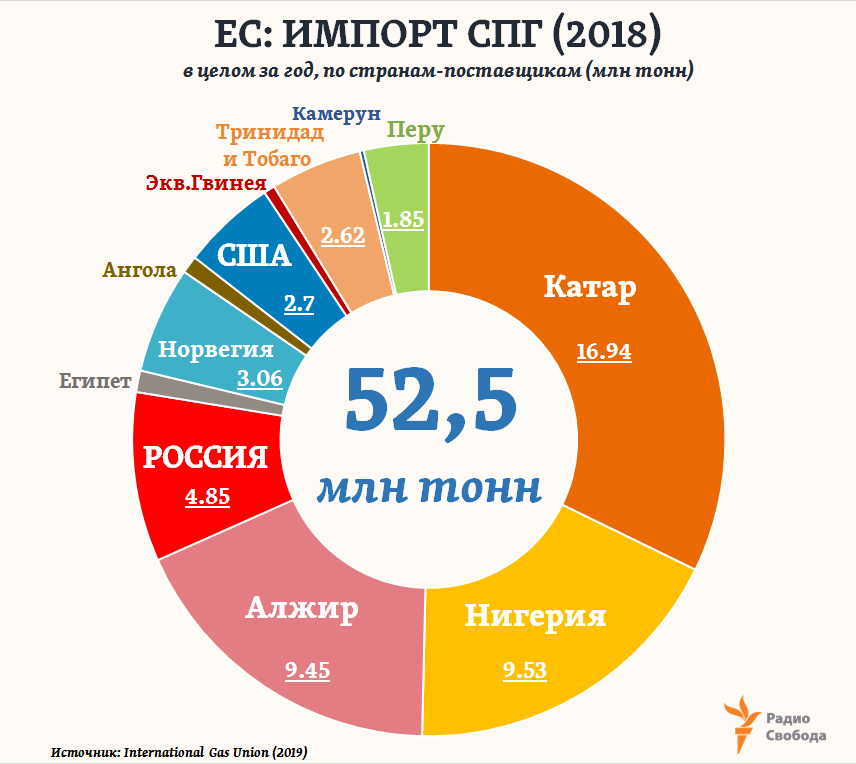 Однако по итогам 2018 года в целом Россия была лишь четвертой среди экспортеров СПГ в страны Европейского союза, отставая от традиционных лидеров в этих поставках в 2–3 раза: