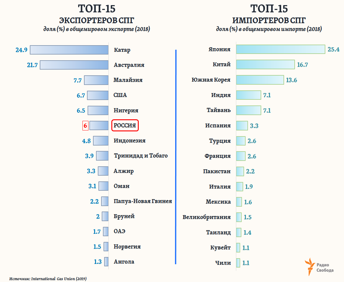 Масштабы таких колебаний объясняются и особенностями структуры мирового рынка сжиженного природного газа. Только на первую тройку стран-экспортеров СПГ приходится сегодня более половины всего экспорта, отмечалось в недавнем обзоре Международного газового союза (IGU), объединяющем более 70 стран мира, а на первую тройку стран-импортеров – почти 56% общемирового его импорта: